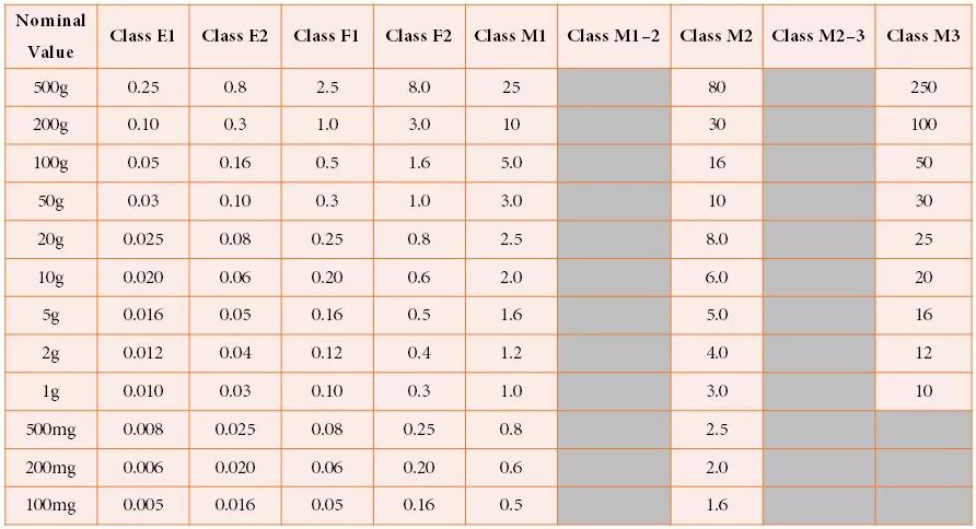 談到校準(zhǔn),起到至關(guān)重要作用的就是砝碼。砝碼的形狀、尺寸、材料、表面狀況、密度、磁性、質(zhì)量標(biāo)稱值、最大允許誤差等指標(biāo)都有非常嚴(yán)格的規(guī)定。作為標(biāo)定、校驗衡器的最普遍也是最重要的工具,國際法制計量組織(OIML)對砝碼進行了明確的等級劃分,共分為9個等級。在砝碼的眾多指標(biāo)當(dāng)中,和校準(zhǔn)關(guān)聯(lián)度最高的就是最大允許誤差(MPE)了,國際相關(guān)法規(guī)條款對各個等級的砝碼的MPE有明確的規(guī)定,以下表格是對電子天平所常用質(zhì)量標(biāo)稱值砝碼MPE的說明(誤差值以毫克為單位):